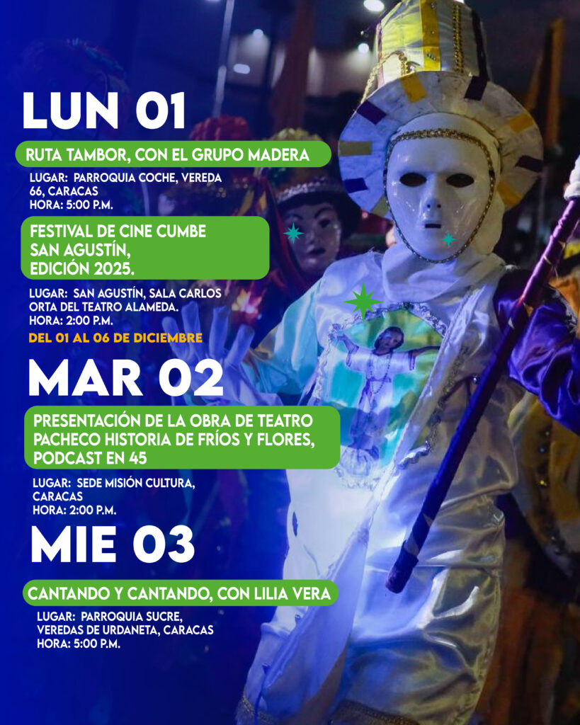 “Van de casa en casa, Viva Venezuela” es el nombre de la actividad que inició este lunes con la “Ruta del tambor, con el Grupo Madera”, en la vereda de Coche, y el “Festival de Cine Cumbe San Agustín, Edición 2025”, que se realiza a las 2:00 pm y se mantendrá hasta el sábado en el Teatro Alameda.