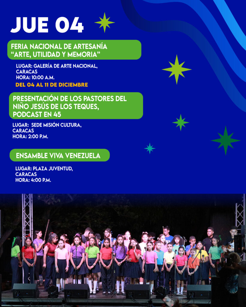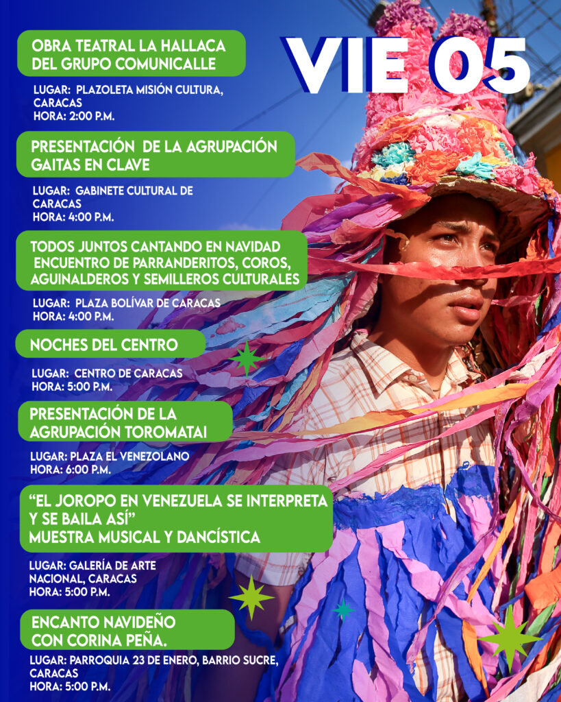 A las 4:00 pm se presentará la agrupación Gaitas en Clave en los espacios del Gabinete Cultural de Caracas, mientras que en el mismo horario se hará en la plaza Bolívar el “Todos juntos cantando en Navidad”, en el contexto del encuentro de parranderitos, coros, aguinalderos y semilleros culturales.
