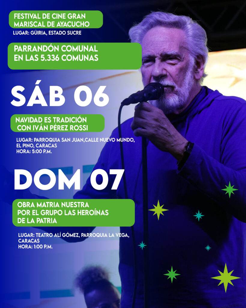 El fin de semana se harán dos actividades.“Navidad es tradición con Iván Pérez Rossi” tendrá lugar a las 5:00 pm del sábado, en la calle Nuevo Mundo de la parroquia San Juan. Mientras que a la 1:00 pm del domingo será la función de la obra “Matria Nuestra” del grupo Las Heroínas de la Patria, en el Teatro Alí Gómez García de La Vega.